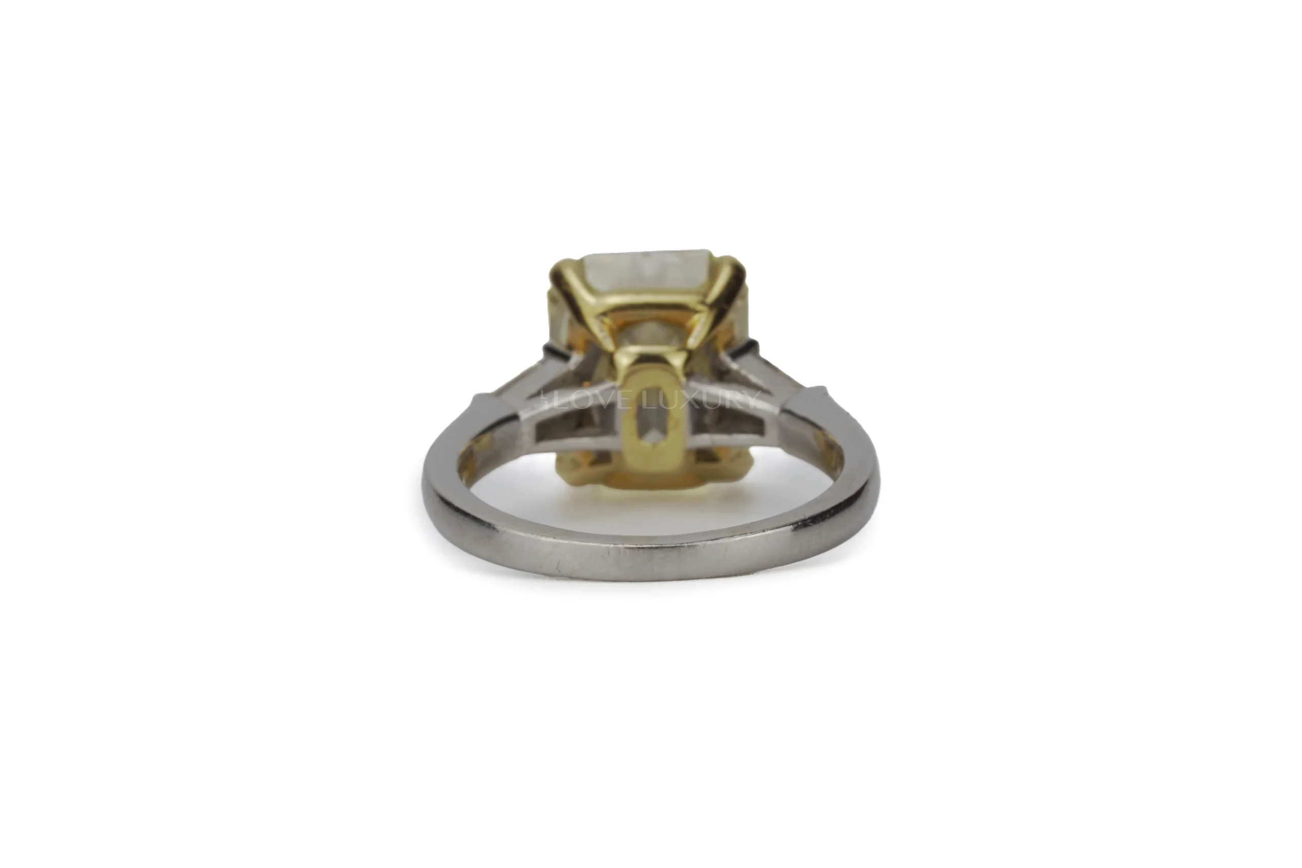 Indulge in the luxury of a preloved GRAFF engagement ring featuring a GIA Certified 6.02 Carat Rectangular Cornered Cut Natural Fancy Yellow Diamond. This exquisite piece seamlessly marries the brilliance of platinum and the warmth of 18-karat yellow gold. The sophisticated design and exceptional craftsmanship make it a timeless symbol of love and elegance. With a GIA certification to authenticate its quality, this GRAFF ring is a precious statement piece, radiating beauty and prestige in every facet.